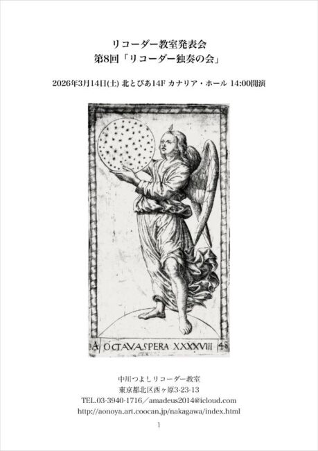 リコーダーと通奏低音のためのソナタ、組曲を演奏する発表会「リコーダー独奏の会」が開催されます。今回は20人の生徒さんが参加し、チェンバロの先生のサポートを受けて、1人1曲、練習の成果である入魂の演奏を披露します。ご来場をお待ちしております!