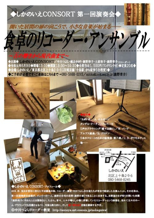 2018年改元を翌年に控えた平成最後の秋、リコーダー奏者・中川つよしの生徒たちが有志で結成した合奏ユニット。その名称は、2019年・令和元年6月9日に開催された第一回演奏会の会場が、メンバーの一人、鹿野の自宅の居間(鹿野の家・しかのいえ)であることに由来する。昔々、人々の暮らしの場に密着していたリコーダーという楽器を、改めて元々のホーム・グラウンドでも活躍させるべく、今後も精力的に、そして目一杯小さく活動を継続する予定。なお、2019年7月6日の宮地楽器小金井店さくらホールでの演奏を機に、その名称は「アンサンブル鹿野音(ろくやおん)」に変更されたが、これはお釈迦さまが悟りを開いた林園「鹿野苑(ろくやおん)」とは一切関係ない(たぶん)。以後「しかのいえCONSORT(コンソート)」の名称は、アンサンブル鹿野音に限らず、「しかのいえ」を舞台に演奏を行う合奏ユニットを指すものとなった。